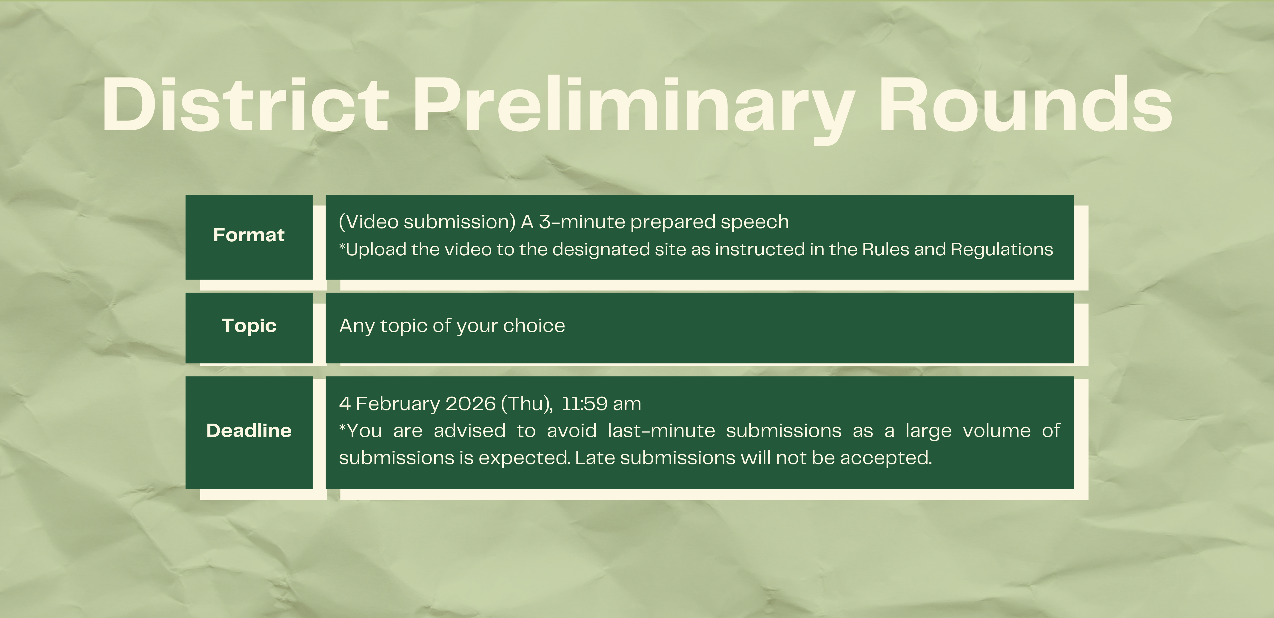 Please refer to "Rules and Regulations" and "Video Submission Guidelines 2026" under "District Preliminary Rounds" tab.
