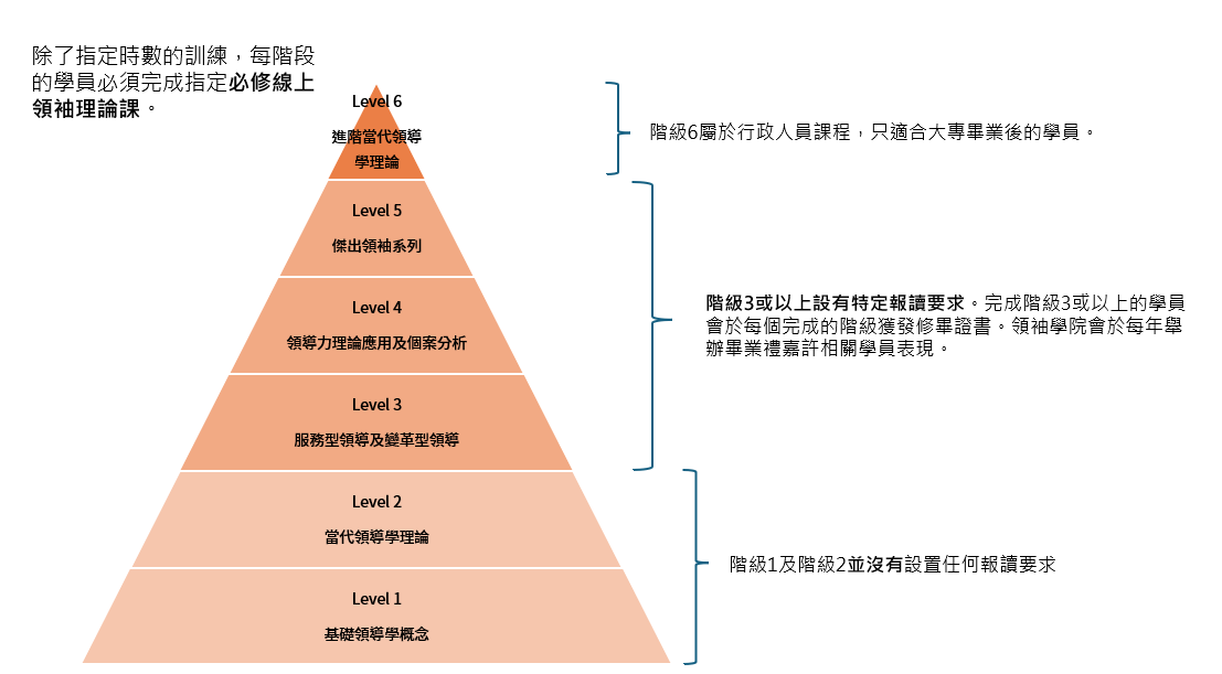 香港青年協會領袖學院領導力認證架構是一個6層階級系統。領袖學院所有課程會根據每層階級所需的技能及課程深淺程度而制訂出課程所屬的階級。學員需要出席指定時數的訓練完成一個特定階級。未完成特定階級的學員不能報讀下一階級課程。學院會為每個學員建立其領袖履歷,記錄他們就讀的每個課程、所獲證書以及領導力發展歷程。